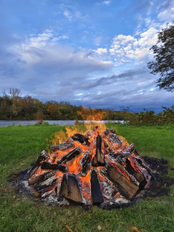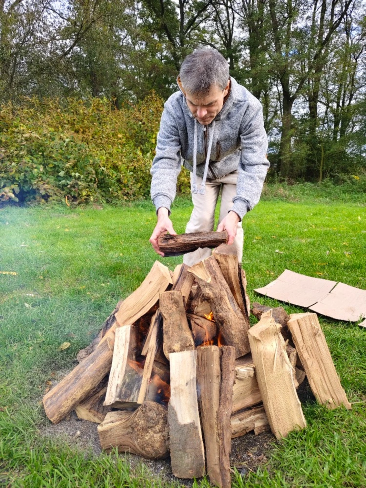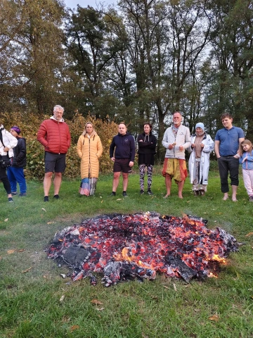 Odpolední program vedli společně Joska Šálek a Jan Rak. Tématem diskuzí bylo pouštění lpění a překročení hranic – fyzických i mentálních, které jsme si sami ve své hlavě vytvořili. A také podrobné vysvětlení aktivit, které následovaly: pády důvěry a rituál Firewalkingu – chůze po žhavých uhlících jako symbol proměny vnitřních omezení. Tak jsme si hned mohli v praxi vyzkoušet, jak zvládáme překročení našich mentálních nastavení. Každý účastník napsal na lísteček to, co chce ve svém životě pustit, a s důvěrou to odevzdsal ohni. Za doprovodu bubnů a v kouzelném podzimním prostředí u Vltavy se z toho stal pro mnohé opravdu léčivý transformační zážitek.